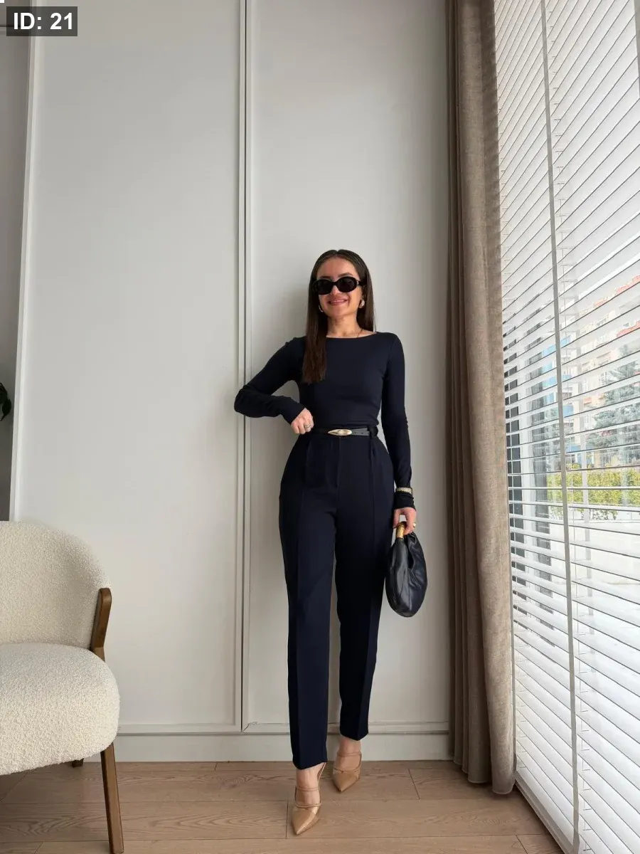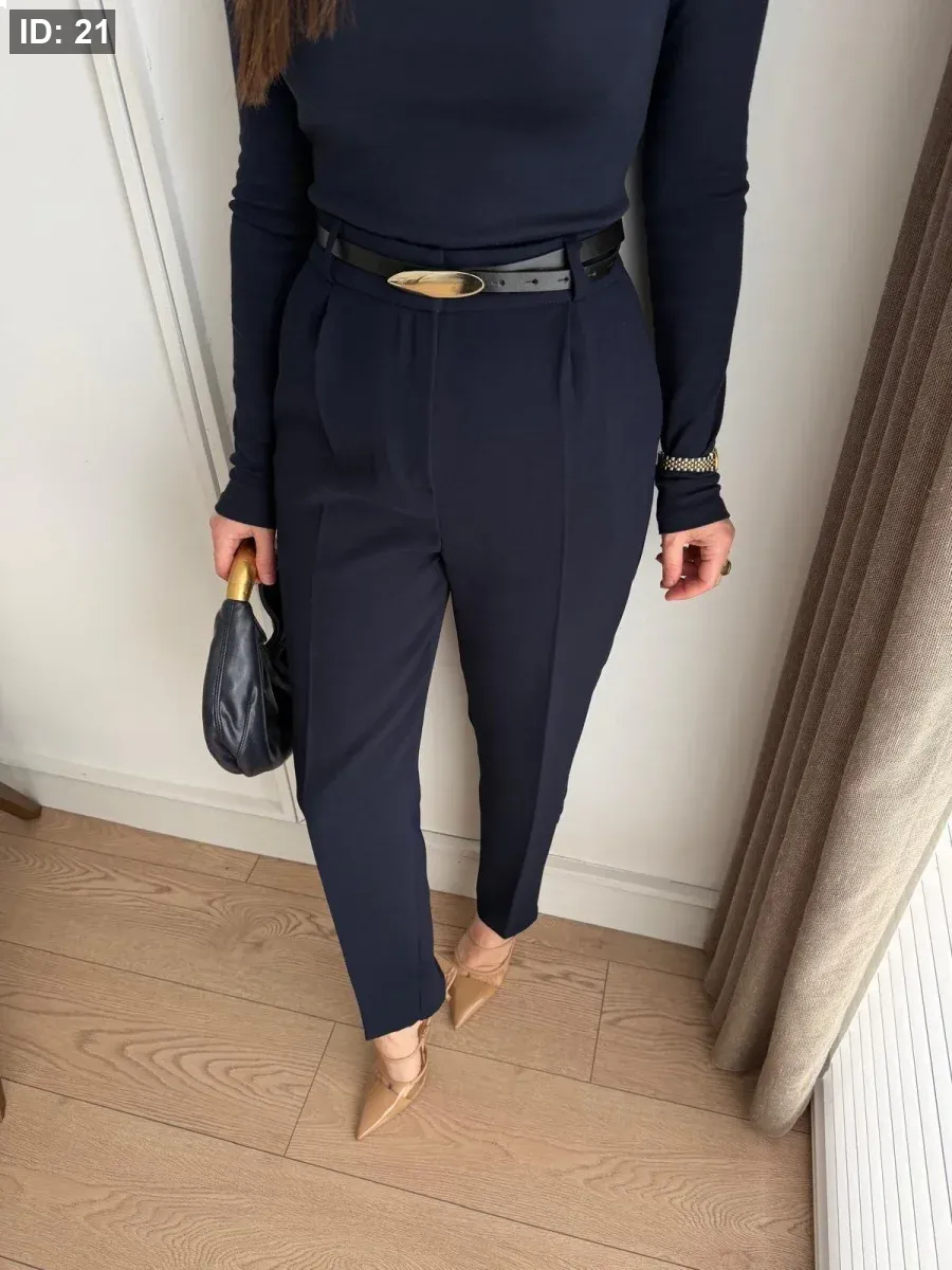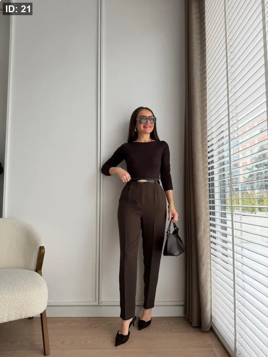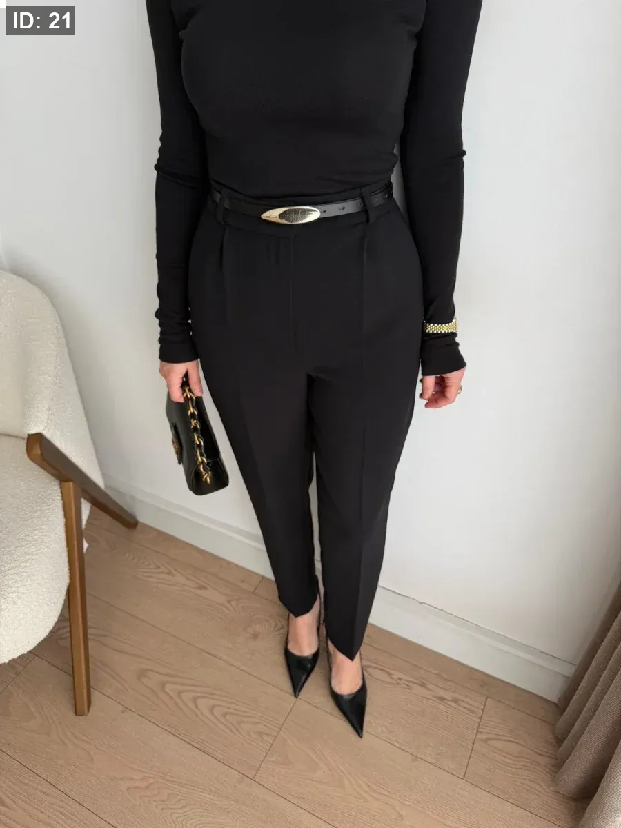 بنطلون قماش مع حزام جلد رفيع خصر عالي