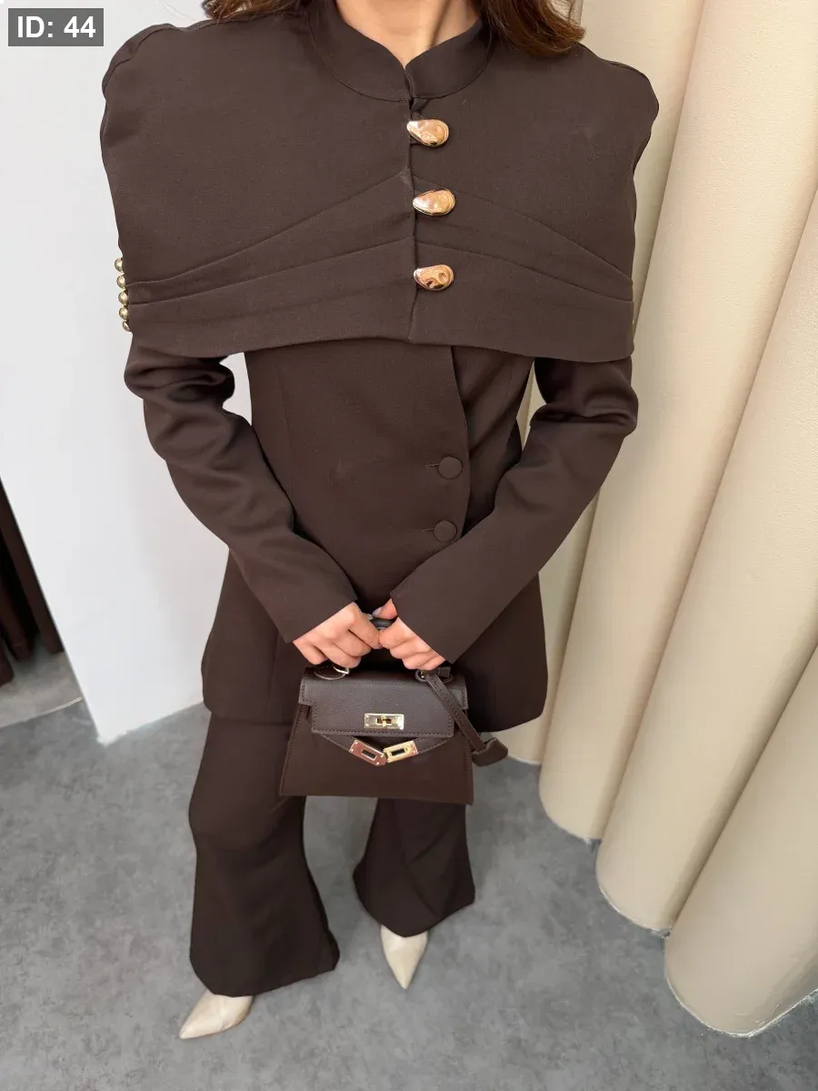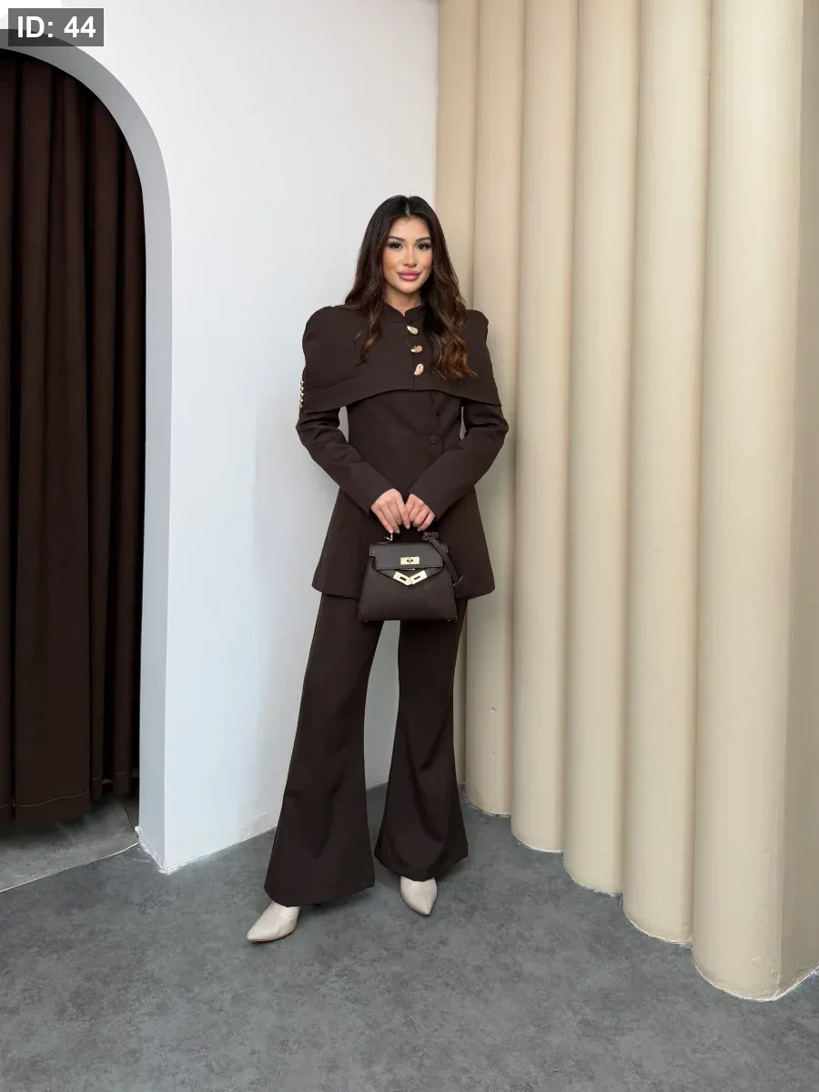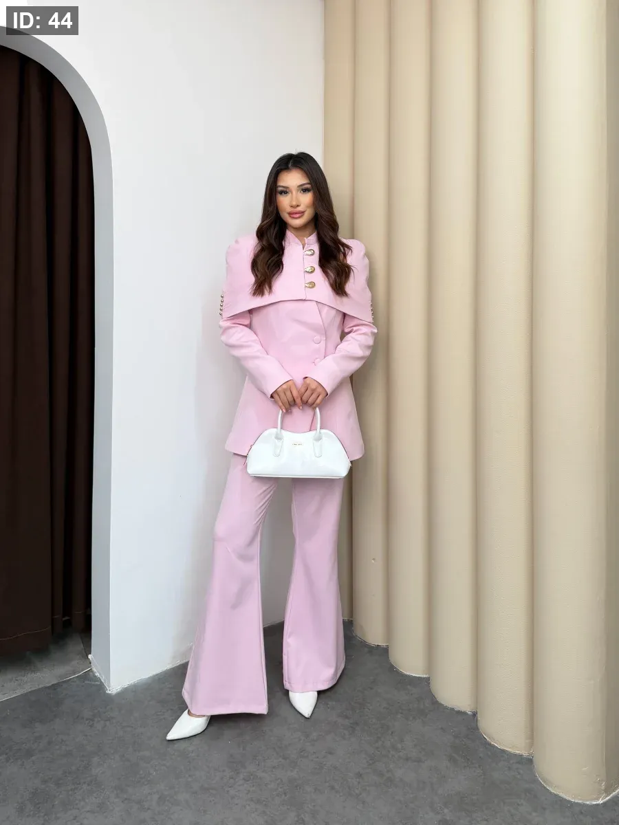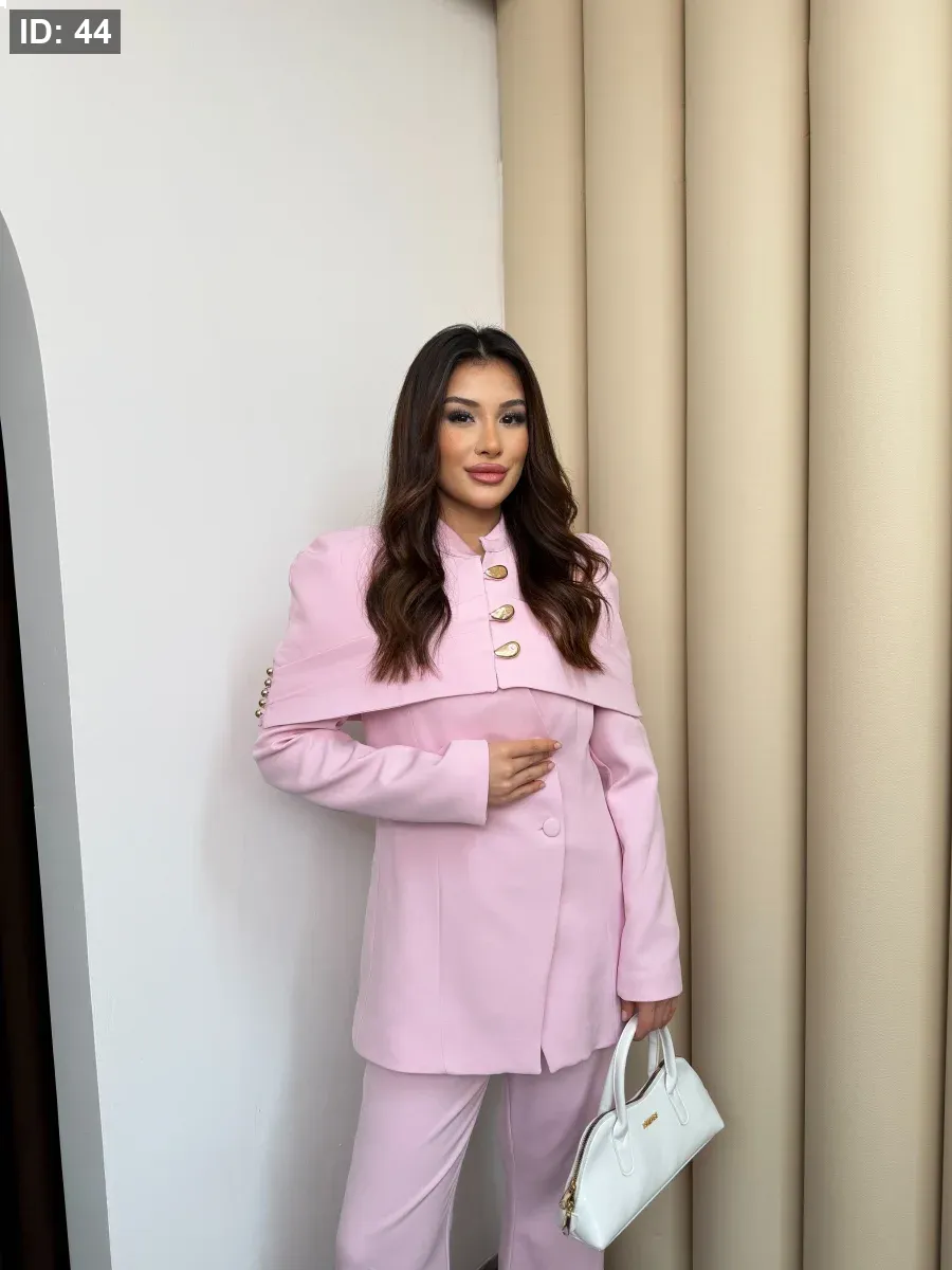 طقم نسائي أنيق يجمع بين الفخامة والبساطة في تصميم واحد. يتميّز بجاكيت بقصّة عصرية مع أزرار معدنية مميّزة تضيف لمسة راقية على الإطلالة، وبنطال واسع بقصّة مريحة.