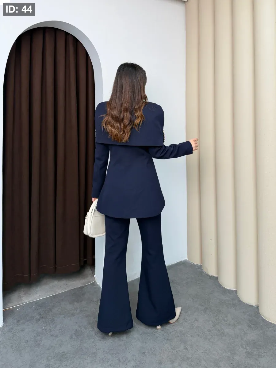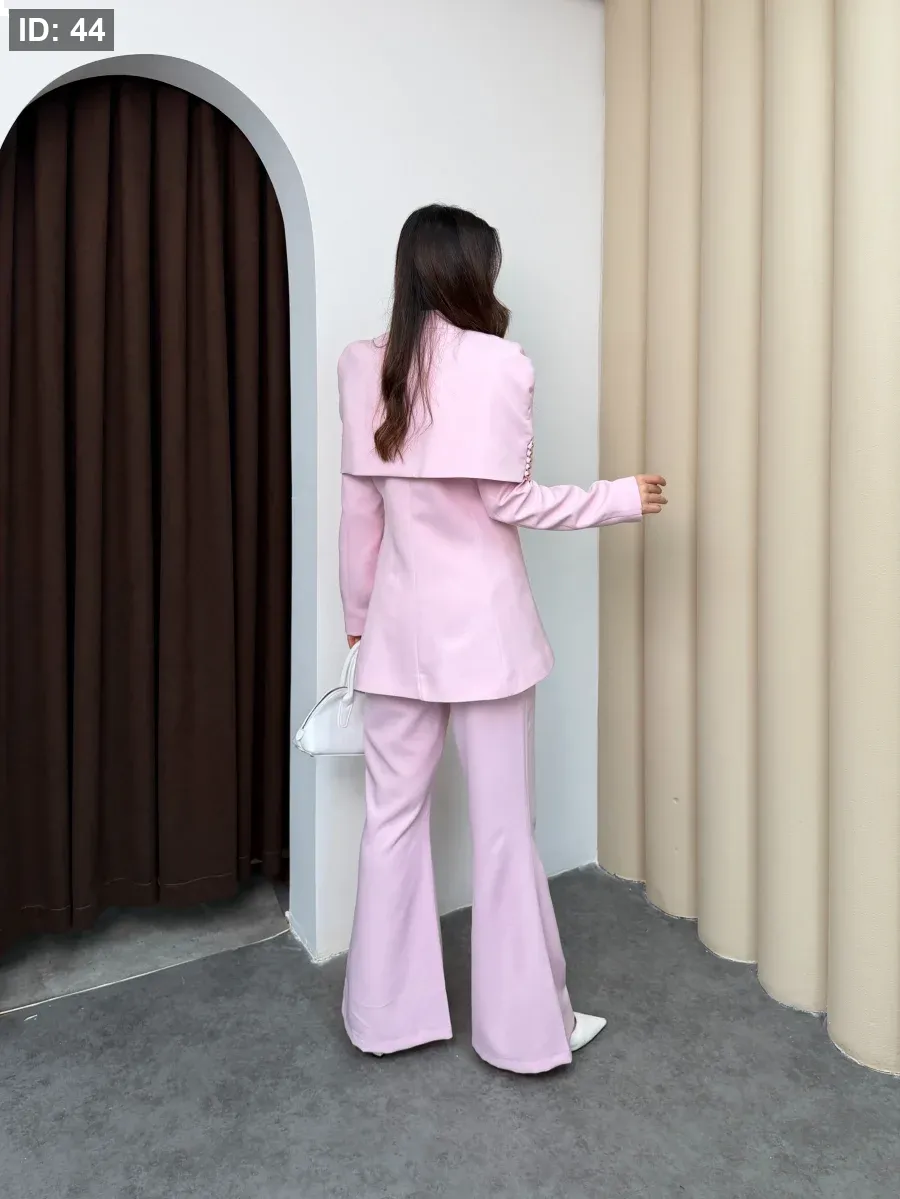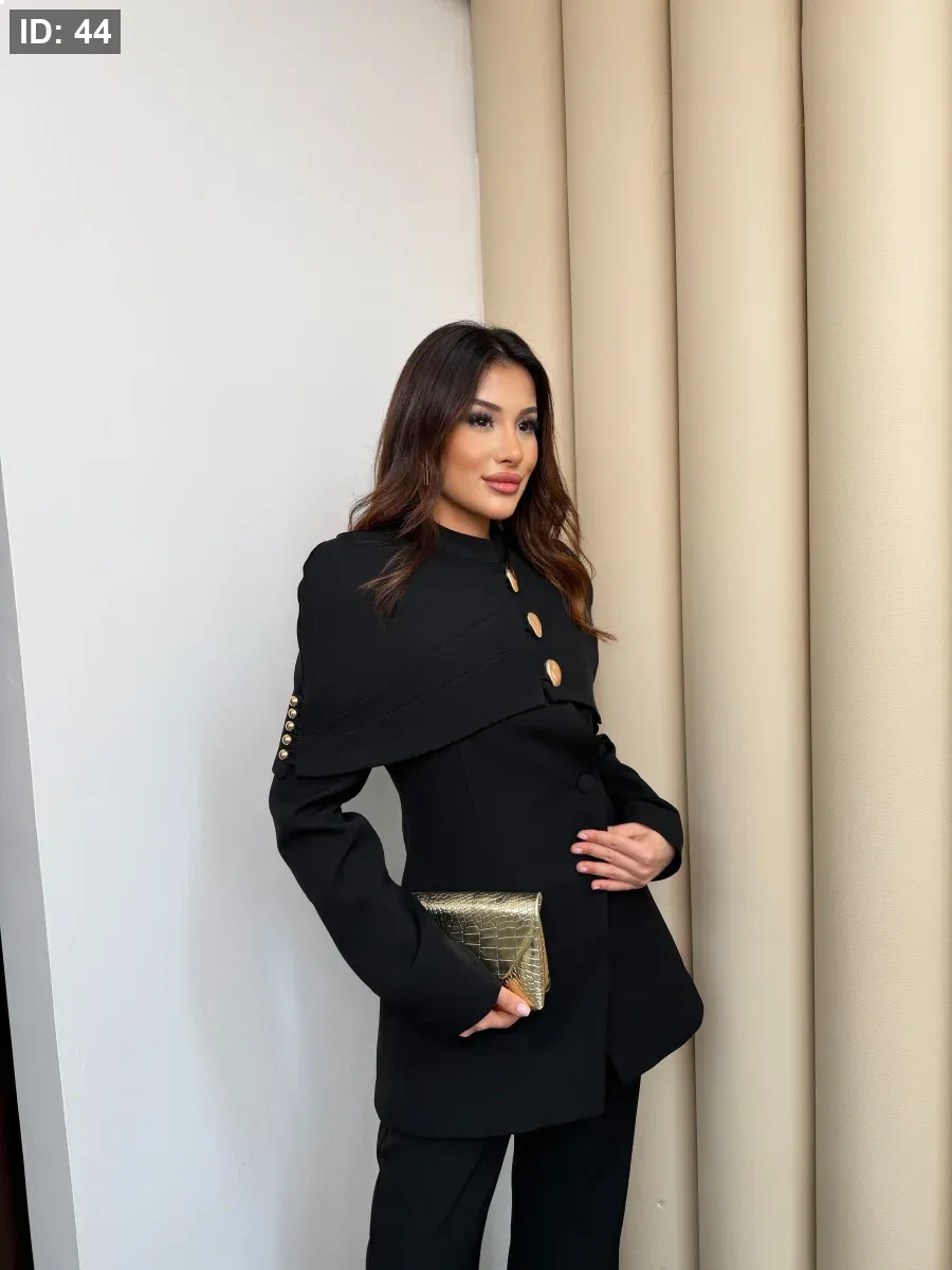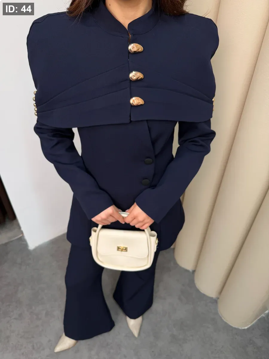 طقم نسائي أنيق يجمع بين الفخامة والبساطة في تصميم واحد. يتميّز بجاكيت بقصّة عصرية مع أزرار معدنية مميّزة تضيف لمسة راقية على الإطلالة، وبنطال واسع بقصّة مريحة.